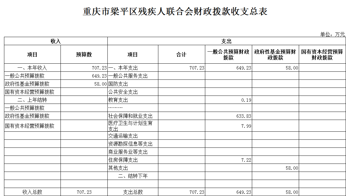 2019年我單位預(yù)算收入合計(jì)為707.23萬(wàn)元,其中:年初一般公共預(yù)算財(cái)政撥款為649.23萬(wàn)元,比2018年增加23.13萬(wàn)元。本年支出合計(jì)707.23萬(wàn)元,對(duì)比2018年減少61.6萬(wàn)元,減少的主要原因一是因?yàn)?019年市殘聯(lián)要求的基本任務(wù)有所精減,導(dǎo)致資金投入減少了25.87萬(wàn)元;二是2018年合理利用了上年結(jié)轉(zhuǎn)資金35.73萬(wàn)元。公共預(yù)算財(cái)政撥款基本支出149.23萬(wàn)元,對(duì)比2018年,增加了8.53萬(wàn)元,增加的主要原因是單位職工工資、交通補(bǔ)貼、離退休人員健康休養(yǎng)費(fèi)等工資福利待遇調(diào)標(biāo)。財(cái)政預(yù)算撥款項(xiàng)目支出558萬(wàn)元,對(duì)比2018年減少了70.13萬(wàn)元,減少的主要原因?yàn)槭袣埪?lián)要求的基本任務(wù)有所精減。