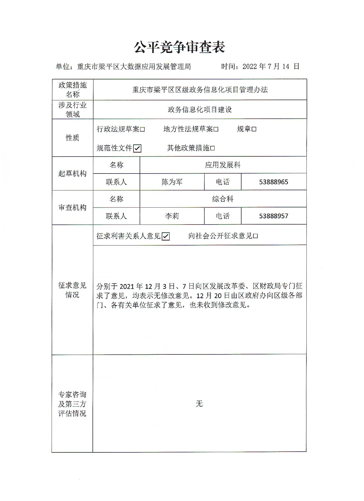 標題 | 重慶市梁平區(qū)區(qū)級政務(wù)信息化項目管理辦法公平競爭審查表 |