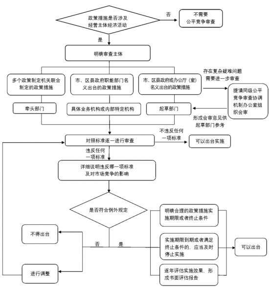 第九條? 政策制定機關(guān)開展公平競爭審查應當遵循審查基本流程(可參考附件1),識別相關(guān)政策措施是否屬于審查對象、判斷是否違反審查標準、分析是否適用例外規(guī)定等。屬于審查對象的,經(jīng)審查后應當在《公平競爭審查表》(可參考附件2)中形成明確的書面審查結(jié)論。
